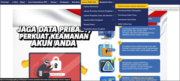 Setelah login dan masuk ke situs Coretax, pilih menu “Layanan Wajib Pajak”, kemudian klik pilihan “Layanan Administrasi”, baru kemudian pilih “Buat Permohonan Layanan Administrasi”.