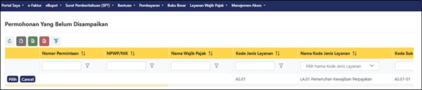 Selanjutnya, pilih menu “Layanan Wajib Pajak”, dilanjutkan memilih “Layanan Administrasi” dan berikutnya pilih “Permohonan Belum Disampaikan”. Sehingga muncul laman “Permohonan yang Belum Disampaikan”.