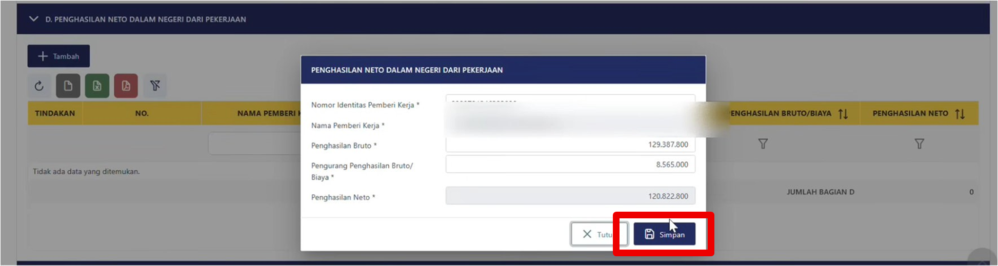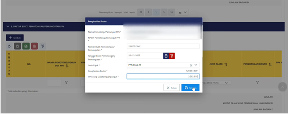 Kemudian lengkapi data sesuai dengan yang ada pada Bukti Potong A1 dan klik “Simpan”, maka nilai Bukti Potong akan secara otomatis bertambah pada induk SPT.