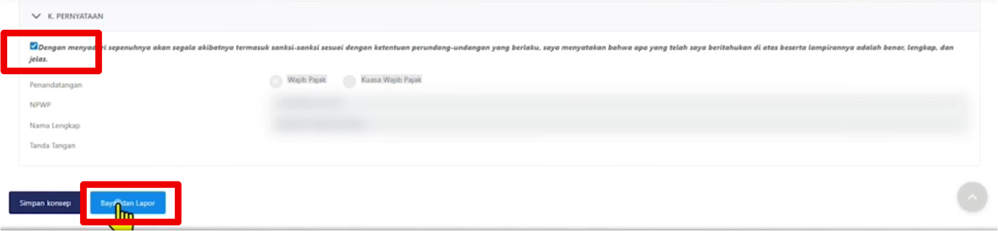 Setelah selesai, maka dapat lanjut untuk melaporkan SPT Orang Pribadi dengan menceklis pernyataan lalu “Bayar dan Lapor”.
