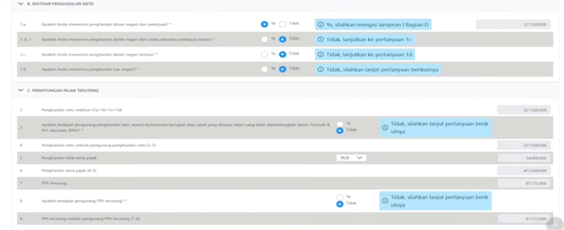 Langkah selanjutnya yaitu mengisi dan melengkapi SPT Induk bagian B dan C dengan memilih “Ya” atau “Tidak” agar data terhitung otomatis oleh sistem Coretax. Berikut contoh pengisian SPT Induk Orang Pribadi.