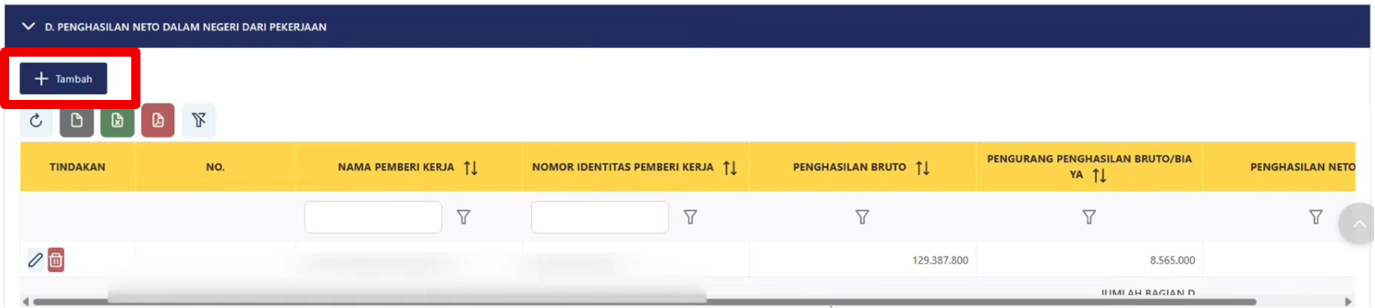 Sama seperti lampiran bagian D, jika Wajib Pajak memiliki 2 Bukti Potong dari pemberi kerja berbeda, maka harus menambahkan manual Bukti Potong A1 dengan mengklik “Tambah”.
